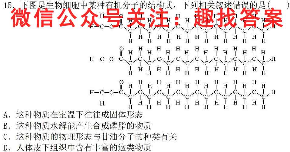 15.下图是生物细胞中某种有机分子的结构式,下列相关叙述错误的是()A.这种物质在室温下往往成固体形态B.这种物质水解能产生合成磷脂的物质C.这种物质的物理形态与甘油分子的种类有关D.人体皮下组织中含有丰富的这类物质