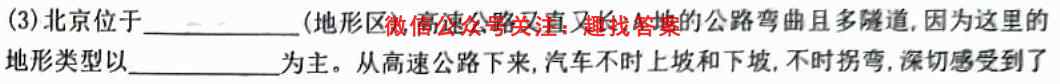 (3)北京位于(地形区),高速公路又直又长;A地的公路弯曲且多隧道,因为这里的地形类型以为主。从高速公路下来,汽车不时上坡和下坡,不时拐弯,深切感受到了“山路十八弯”,真是一路向南一路弯。(2分)