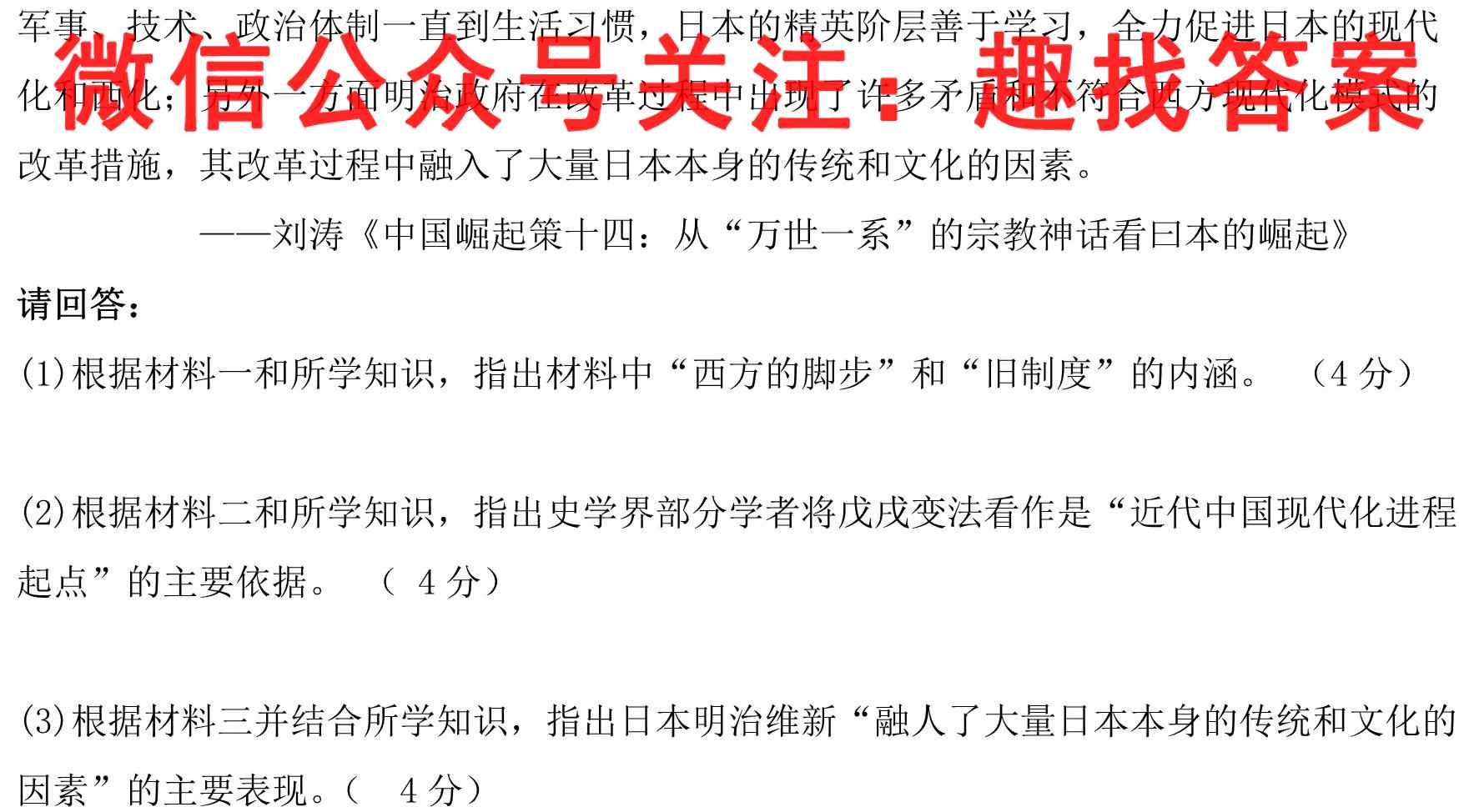 材料三:在明治维新期间,我们发现了一个奇特的现象。一方面日本全面学*西方,从军事、技术、政治体制一直到生活*惯,日本的精英阶层善于学*,全力促进日本的现代化和西化;另外一方面明治政府在改革过程中出现了许多矛盾和不符合西方现代化模式的改革措施,其改革过程中融入了大量日本本身的传统和文化的因素。——刘涛《中国崛起策十四:从“万世一系”的宗教神话看曰本的崛起》请回答:(1)根据材料一和所学知识,指出材料中“西方的脚步”和“旧制度”的内涵。(4分)(2)根据材料二和所学知识,指出史学界部分学者将戊戌变法看作是“近代中国现代化进程起点”的主要依据。(4分)(3)根据材料三并结合所学知识,指出日本明治维新“融人了大量日本本身的传统和文化的因素”的主要表现。(4分)