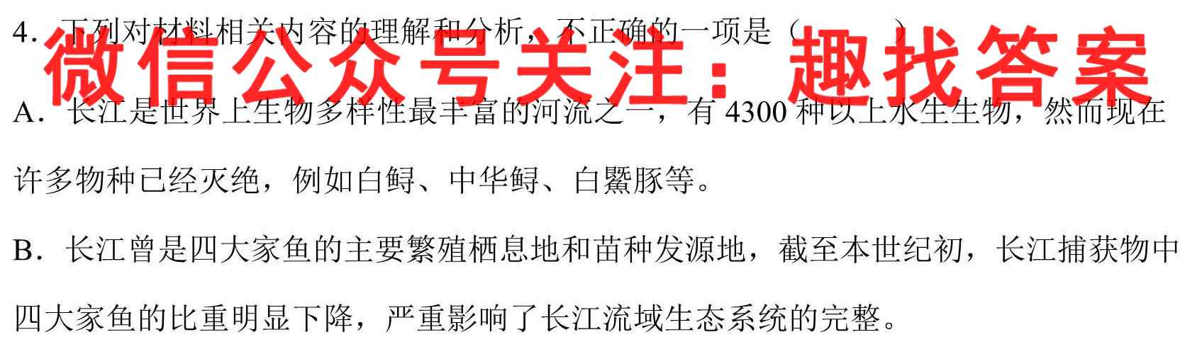 4.下列对材料相关内容的理解和分析,不正确的一项是()许多物种已经灭绝,例如白鲟、中华鲟、白豚等。A.长江是世界上生物多样性最丰富的河流之一,有4300种以上水生生物,然而现在四大家鱼的比重明显下降,严重影响了长江流域生态系统的完整。B.长江曾是四大家鱼的主要繁殖栖息地和苗种发源地,截至本世纪初,长江捕获物中