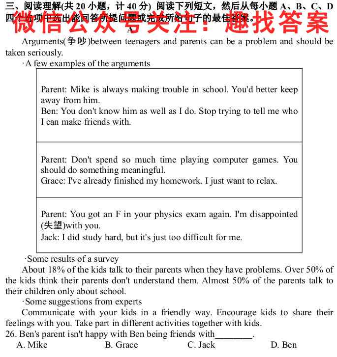 三、阅读理解(共20小题,计40分)阅读下列短文,然后从每小题A、B、C、D四个选项中选出能回答所提问题或完成所给句子的最佳答案。AArguments(争吵) between teenagers and parents can be a problem and should betaken seriously.A few examples of the argumentsSome results of a surveyAbout 18%of the kids talk to their parents when they have problems. Over 50% ofthe kids think their parents don’t understand them. Almost 50% of the parents talk totheir children only about school.Some suggestions from expertsCommunicate with your kids in a friendly way. Encourage kids to share theirfeelings with you.Take part in different activities together with kids.26.Ben’s parent is n’t happy with Ben being friends with .____A.Mike B.Grace C.Jack D.Ben