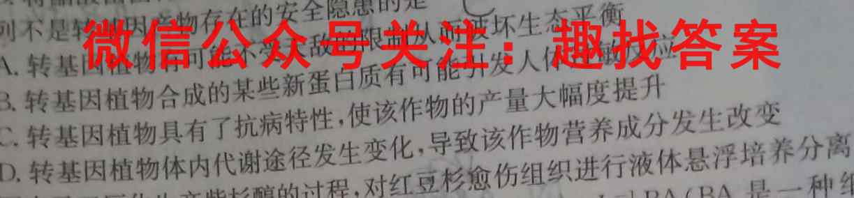 7.下列不是转基因产物存在的安全隐患的是CA.转基因植物有可能不受天敌的限制从而破坏生态平衡B.转基因植物合成的某些新蛋白质有可能引发人体过敏反应C.转基因植物具有了抗病特性,使该作物的产量大幅度提升D.转基因植物体内代谢途径发生变化,导致该作物营养成分发生改变