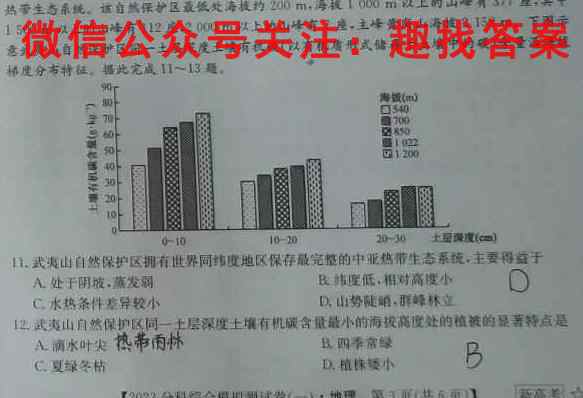 武美山自然保护区位于式山昧北段的较高部位,初有世界间纬度地区保存最完整的中亚热带生态系统。该自然保护区最低处海技约200m,.海拔1000m以上的山峰有377应,其中1500m以上的山峰有112座,2000m以上的山峰有7座,主峰黄岗山海拔2158、下示意武夷山自然保护区一土层深度土壤有机碳(以有机质形式储存于土壤中的碳)含量沿海拔梯度分布特,据此完成11~13题。11.武夷山自然保护区拥有世界同纬度地区保存最完整的中亚热带生态系统,主要得益于A.处于阴坡,蒸发弱B纬度低,相对高度小C.水热条件差异较小D.山势陡销,群峰林立12.武夷山自然保护区同一土层深度土壤有机碳含量最小的海拔高度处的植被的显著特点是A.滴水叶尖热带雨林B.四季常绿C.夏绿冬枯D.植株小B