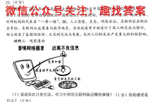 23.(8分)材料一2022年世界互联网大会在浙江省桐乡市乌镇“互联网之光博览中心”举办。近2000名来自各国政府、国际组织、行业机构、中外互联网企业、高校智库、科研机构的代表在“一带一路”、5G、人工智能、生态、网络法治、互联网企业的社会责任、互联网公益慈善与数字减贫、全球**等方面进行了深入的交流与探讨,极大促进了各国间经济、文化的交流与发展,也对人们的生活产生重大的积极影响。材料二观察漫画惕网络圏套远离不良信息(1)说说你在日常生活、学*中利用互联网做过哪些事情?(1分)你的感受是什么?(2分)
