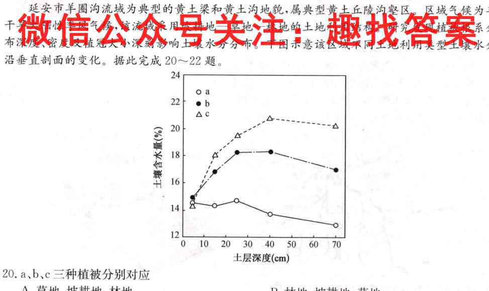 延安市羊圈沟流域为典型的黄土梁和黄土沟地貌,属典型黄土丘陵沟壑区。区域气候为干旱大陆性季风气候,该流域采用坡耕地一草地一林地的土地利用结构。研究发现植被根系布深度、密度及植冠大小深刻影响土壤水分分布。下图示意该区域不同土地利用类型土壤水沿垂直剖面的变化。据此完成2022题。