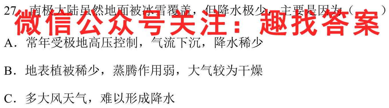 27.南极大陆虽然地面被冰雪覆盖,但降水极少,主要是因为()A.常年受极地高压控制,气流下沉,降水稀少B.地表植被稀少,蒸腾作用弱,大气较为干燥C.多大风天气,难以形成降水D.全球变暖,冰雪大量消融,冰川面积减小
