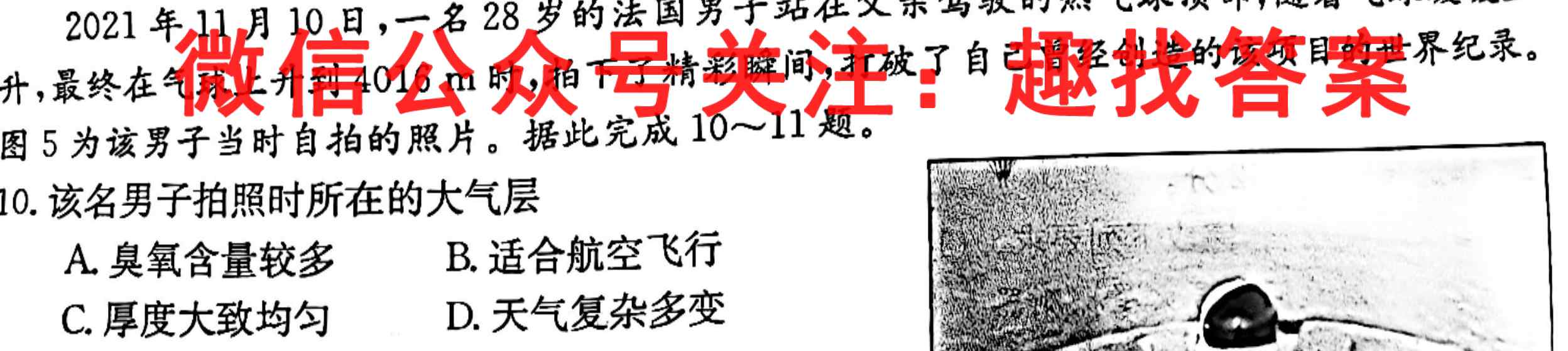 2021年11月10日,一名28岁的法国男子站在父亲驾驶的热气球顶部,随着气球缓缓上升,最终在气球上升到4016m时,拍下了精彩瞬间,打破了自己曾经创造的该项目的世界纪录。图5为该男子当时自拍的照片。据此完成10∼11题。10.该名男子拍照时所在的大气层A.臭氧含量较多B.适合航空飞行C.厚度大致均匀D.天气复杂多变