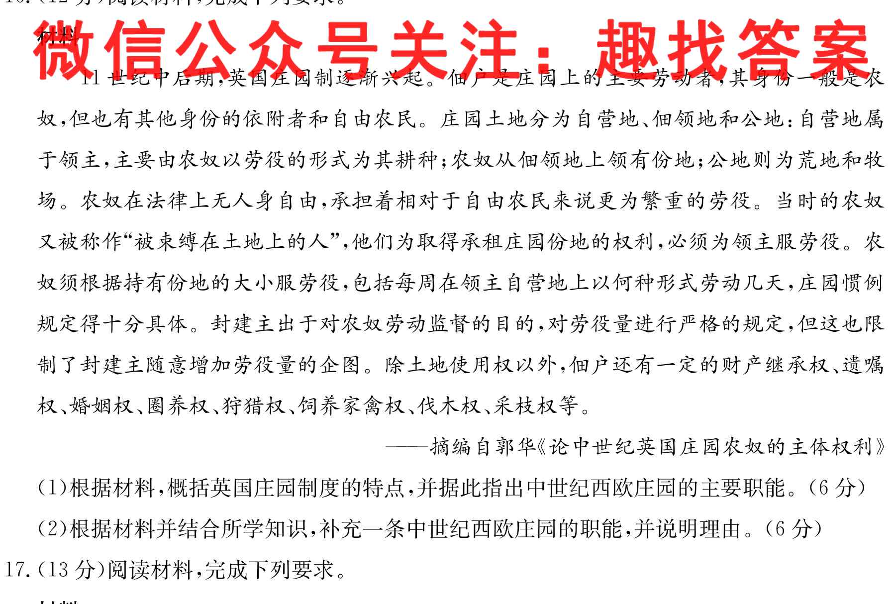 材料11世纪中后期,英国庄园制逐渐兴起。佃户是庄园上的主要劳动者,其身份一般是农奴,但也有其他身份的依附者和自由农民。庄园土地分为自营地、佃领地和公地:自营地属于领主,主要由农奴以劳役的形式为其耕种;农奴从佃领地上领有份地;公地则为荒地和牧场。农奴在法律上无人身自由,承担着相对于自由农民来说更为繁重的劳役。当时的农奴又被称作“被束缚在土地上的人”,他们为取得承租庄园份地的权利,必须为领主服劳役。农奴须根据持有份地的大小服劳役,包括每周在领主自营地上以何种形式劳动几天,庄园惯例规定得十分具体。封建主出于对农奴劳动监督的目的,对劳役量进行严格的规定,但这也限制了封建主随意增加劳役量的企图。除土地使用权以外,佃户还有一定的财产继承权、遗嘱权、婚姻权、圏养权、狩猎权、饲养家禽权、伐木权、采枝权等。——摘编自郭华《论中世纪英国庄园农奴的主体权利》(1)根据材料,概括英国庄园制度的特点,并据此指出中世纪西欧庄园的主要职能。(6分)(2)根据材料并结合所学知识,补充一条中世纪西欧庄园的职能,并说明理由。(6分)17.(13分)阅读材料,完成下列要求。