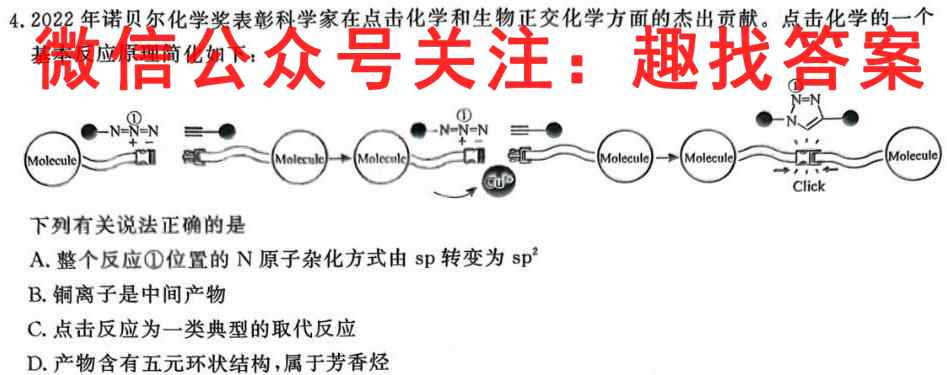 4.2022年诺贝尔化学奖表彰科学家在点击化学和生物正交化学方面的杰出贡献。点击化学的一个基本反应原理简化如下:下列有关说法正确的是A.整个反应①位置的N原子杂化方式由sp转变为sp^2B.铜离子是中间产物C.点击反应为一类典型的取代反应D.产物含有五元环状结构,属于芳香烃