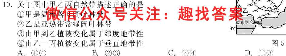 10.关于图中甲乙丙自然带描述正确的是①甲是温带落叶阔叶林带②乙是亚热带常绿阔叶林带③由甲到乙植被变化属于纬度地带性④由乙一丙植被变化属于垂直地带性A.①④B.②③C.②④D.①③