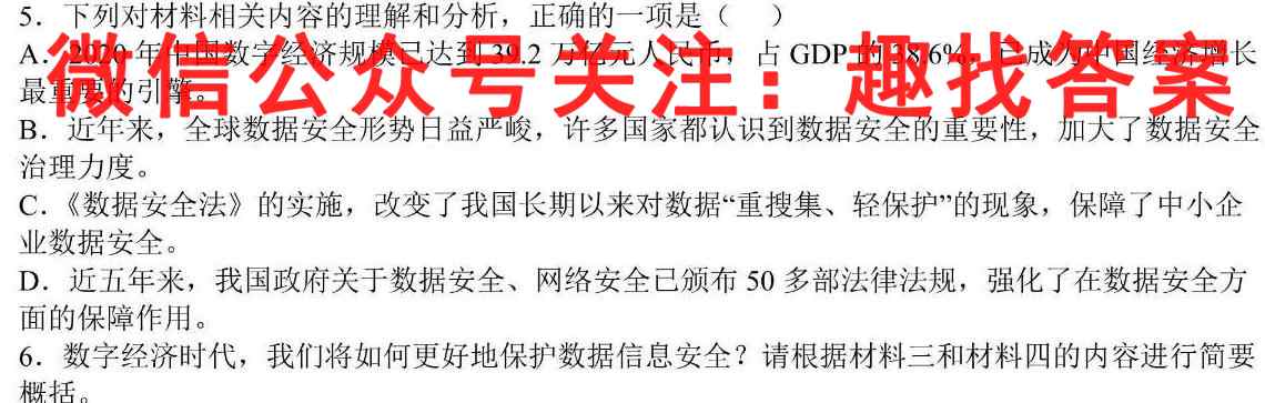 5.下列对材料相关内容的理解和分析,正确的一项是()A.2020年中国数字经济规模已达到39.2万亿元人民币,占GDP的38.6%,已成为中国经济增长最重要的引擎。B.近年来,全球数据安全形势日益严峻,许多国家都认识到数据安全的重要性,加大了数据安全治理力度。C.《数据安全法》的实施,改变了我国长期以来对数据“重搜集、轻保护”的现象,保障了中小企业数据安全。D.近五年来,我国政府关于数据安全、网络安全已颁布50多部法律法规,强化了在数据安全方面的保障作用。6.数字经济时代,我们将如何更好地保护数据信息安全?请根据材料三和材料四的内容进行简要概括。