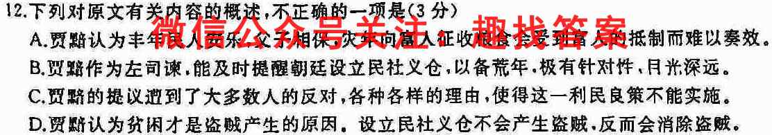 12.下列对原文有关内容的概述,不正确的一项是(3分)A.贾黯认为丰年民人安乐,父子相保,灾年向富人征收粮食会受到富人的抵制而难以奏效。B.贾黯作为左司谏,能及时提醒朝廷设立民社义仓,以备荒年,极有针对性、月光深远。C.贾黯的提议遭到了大多数人的反对,各种各样的理由,使得这一利民良策不能实施。D.贾斯认为贫闲才是盗贼产生的原因,设立民社义仓不会产生盗贼,反而会消除盗贼。