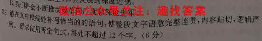 22.D.我们路会不断推动改革向广度和深度进军。22.请在文中横线处补写恰当的的语句,使整段文字语意完整连贯,内容贴切,逻辑严密。要求使用否定句式,每处不超过12个字。(6分)