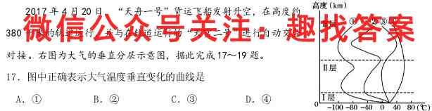 高度(km)2017年4月20日,“天舟一号”货运飞船发射升空,在高度约380千米的轨道运行,并与在轨道运行的“天宫二号”进行自动交会对接。右图为大气的垂直分层示意图,据此完成17∼19题。17.图中正确表示大气温度垂直变化的曲线是A.①B.②C.③D.④