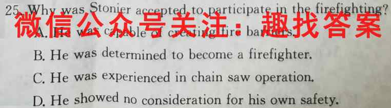 25.Why was Stonier accepted to participate in the firefighting?A.He was capable of creating fire barriers.B.He was determined to become a firefighter.C.He was experienced in chain saw operation.D.He showed no consideration for his own safety.