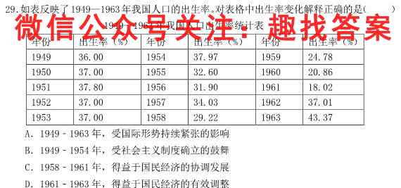 29.如表反映了1949—1963年我国人口的出生率。对表格中出生率变化解释正确的是()1949—1963年我国人口出生率统计表A.1949-1963年,受国际形势持续紧张的影响B.1949-1954年,受社会主义制度确立的鼓舞C.1958-1961年,得益于国民经济的协调发展D.1961-1963年,得益于国民经济的有效调整