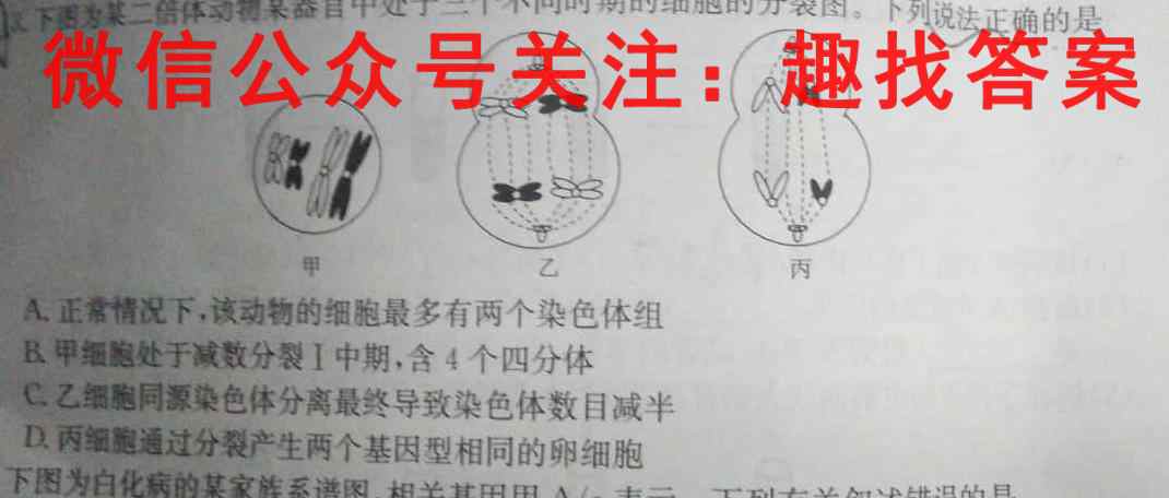 下图为某二倍体动物某器官中处于三个不同时期的细胞的分裂图。下列说法正确的是AA.正常情况下,该动物的细胞最多有两个染色体组B.甲细胞处于减数分裂I中期,含4个四分体C.乙细胞同源染色体分离最终导致染色体数目减半D.丙细胞通过分裂产生两个基因型相同的卵细胞