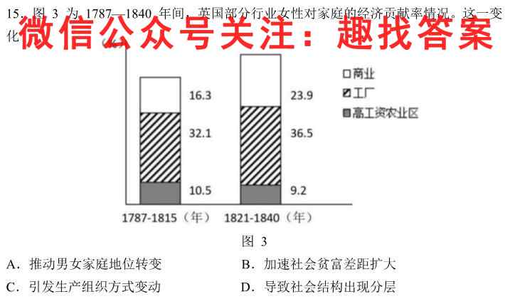 15.图3为1787—1840年间,英国部分行业女性对家庭的经济贡献率情况。这一变化(%)1787-1815(年)1821-1840(年)图3A.推动男女家庭地位转变B.加速社会贫富差距扩大C.引发生产组织方式变动D.导致社会结构出现分层