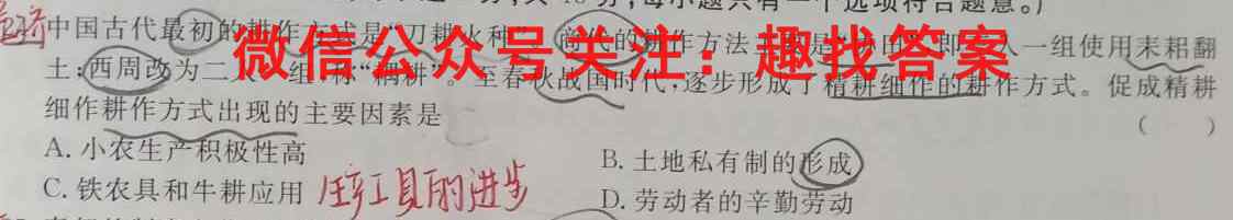一、选择题(本题共12小题,每小题4分,共48分,每小题只有一个选项符合题意。)先秦的农业经济中国古代最初的耕作方式是“刀耕火种”。商代的讲作方法主要是*协用”,即组使用未超土;四周改为二人一组,称“耦耕”。至春秋战国时代,逐步形成了精耕细作的耕作方式。促成精耕细作耕作方式出现的主要因素是()A.小农生产积极性高B.土地私有制的形成C.铁农具和牛耕应用生产工具的进步D.劳动者的辛勤劳动