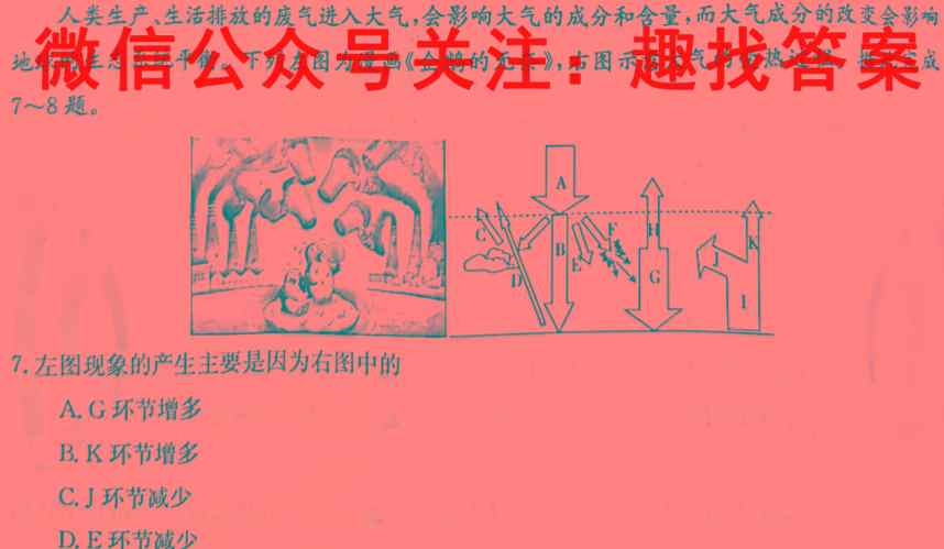 人类生产、生活排放的废气进入大气,会影响大气的成分和含量,而大气成分的改变会影响地球的生态系统平衡。下列左图为漫画《企鹅的无奈》,右图示意大气的受热过程。据此完成7~8题。7.左图现象的产生主要是因为右图中的A.G环节增多B.K环节增多C.J环节减少D.E环节减少