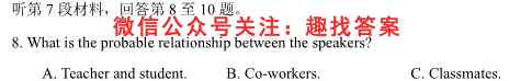 听第7段材料,回答第8至10题。8.What is the probable relationship between the speakers?A.Teacher and student.B.Co-workers. C.Classmates.