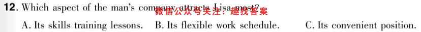 12.Which aspect of the man’s company attracts Lisa most?A.Its skills training lessons. B.Its flexible work schedule.C.Its convenient position.