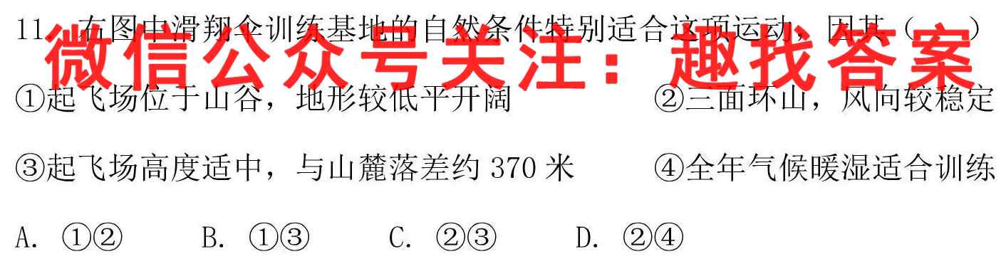 11.右图中滑翔伞训练基地的自然条件特别适合这项运动,因其()①起飞场位于山谷,地形较低平开阔②三面环山,风向较稳定③起飞场高度适中,与山麓落差约370米④全年气候暖湿适合训练A.①②B.①③C.②③D.②④