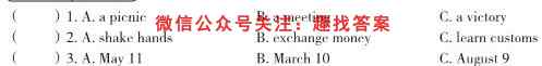 ( ) 1.A.a picnic B.a meeting C.a victory( ) 2.A.shake hands B.exchange money C.learn customs( ) 3.A.May 11 B.March 10 C.August 9