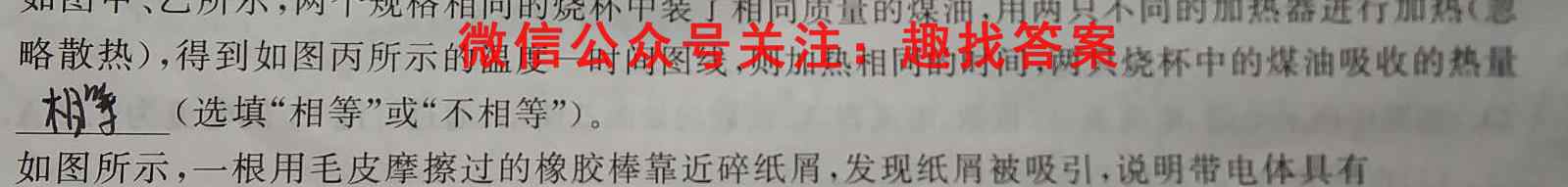 加热器甲4.如图甲、乙所示,两个规格相同的烧杯中装了相同质量的煤油,用两只不同的加热器进行加热(忽略散热),得到如图丙所示的温度一时间图线,则加热相同的时间,两只烧杯中的煤油吸收的热量相等(选填“相等”或“不相等”)。
