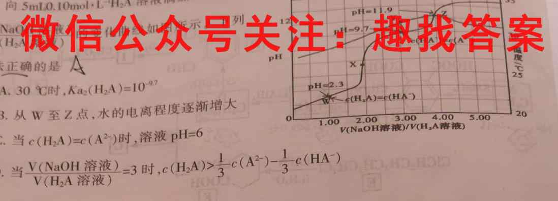 过程中溶14.向5mL0.10mol+LHA溶液滴加一定浓度的NaOH溶液,滴定过程中溶液pH和温度随5mL0.10molL^-1H2AV(NaOHV(H2A)A1溶液液)的变化曲线如图所示。下列说法正确的是pHA.30^C时,Ka2(H2A)=10^-9.7B.从W至Z点,水的电离程度逐渐增大C.当c(HA)=c(A时,溶液pH=6c(H2A)=c(A^2-)D.当V(NaOHV(H2A)1=3c(H2A)>13c(A^2-)-13c(HA^-)