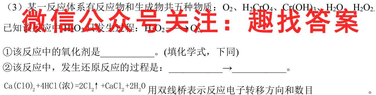 (3)某一反应体系有反应物和生成物共五种物质:O2、H2CrO4、Cr(OH)3、H2O、H2O2已知该反应中H2O2只发生过程:H2O2[]O2.①该反应中的氧化剂是。(填化学式,下同)②该反应中,发生还原反应的过程是:→。Ca(ClO)2+4HCl(浓.)=2Cl2+CaCl2+2H2O。用双线桥表示反应电子转移方向和数目
