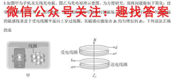 5.如图甲为手机及无线充电板。图乙为充电原理示意图。为方便研究,现将问题做如下简化:设受电线圈的匝数为n,,面积为Sn,该区域的磁场可视为匀强磁场;若在t1到t2时间内,匀强磁场的磁感线垂直于受电线圈平面向上穿过线圈,其磁感应强度由B1均匀增加到B2,,下列说法正确的是