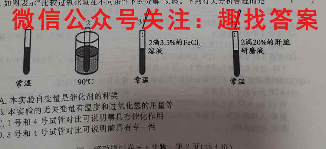 12.如图表示“比较过氧化氢在不同条件下的分解”实验。下列有关分析合理的是1常温常温常温32滴3.5%的FeCl3溶液A.本实验自变量是催化剂的种类B.本实验的无关变量有温度和过氧化氢的用量等C.1号和4号试管对比可说明酶具有催化作用D.3号和4号试管对比可说明酶具有专一性