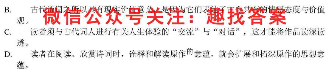 B.古代诗词之所以具有现实价值意义,是因为它们表达了古今共有的情感态度与价值观。C.读者须与古代词人进行有关人生体验的“交流”与“对话”,这才能将作品读深读透。D.读者在阅读、欣赏诗词时,诠释和解读原作的意蕴,就会扩展和拓深原作的思想意蕴