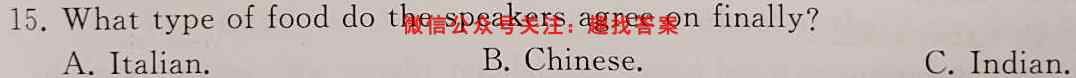 15.What type of food do the speakers agree on finally?A.Italian. B.Chinese. C.Indian.