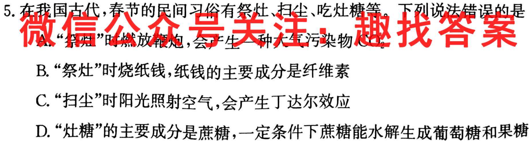 5.在我国古代,春节的民间*俗有祭灶、扫尘、吃灶糖等。下列说法错误的是A.“祭灶”时燃放鞭炮,会产生一种大气污染物CO2B.“祭灶”时烧纸钱,纸钱的主要成分是纤维素C.“扫尘”时阳光照射空气,会产生丁达尔效应D.“灶糖”的主要成分是蔗糖,一定条件下蔗糖能水解生成葡萄糖和果糖