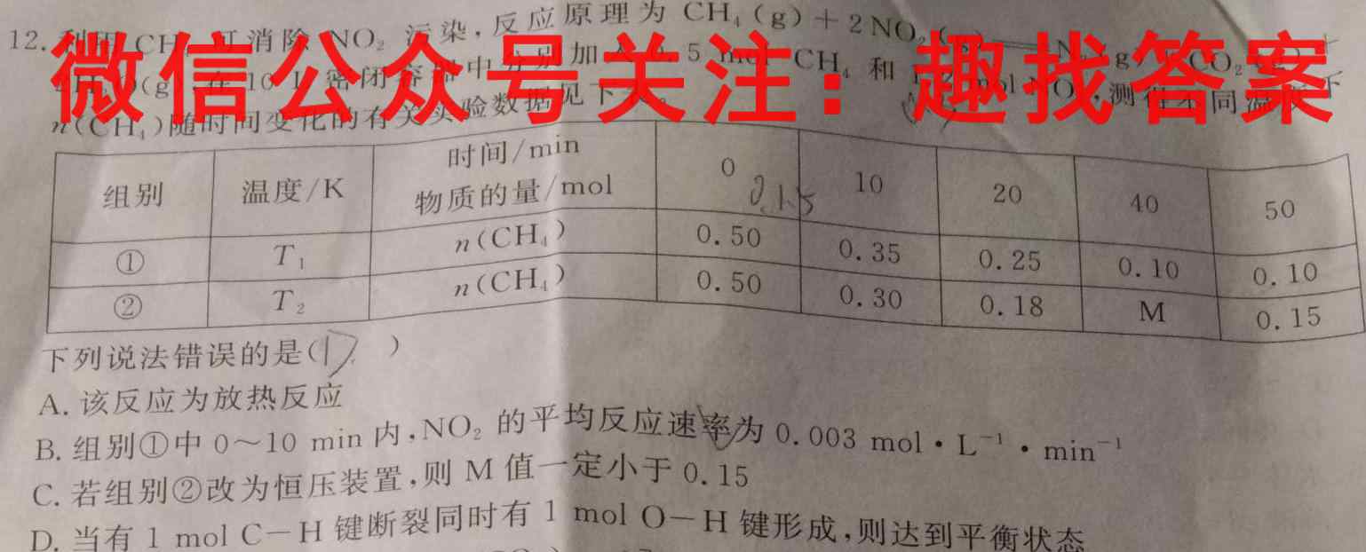 12.利用CH,可消除NO,污染,反应原理为CH(g)+2NO(g)CH4NO2别0.5molCH4CH4(g)+2NO2(g)N2(g)+CO2NO(g)N(g)+Co((g2HO(g),在10L密闭容器中分别加入0.5molCH,和1.2molNO,测得不同温度2H2O(g),n(CH,)随时间变化的有关实验数据见下表。0.3测下下列说法错误的是(17.)A.该反应为放热反应NO2B.组别①中0~10min内,NO,的平均反应速0∼10min率为0.003molL^-1^-1C.若组别②改为恒压装置,则M值一定小于0.15②D.当有1molC-H键断裂同时有1molO-H键形成,则达到平衡状态1molC-H1molO-H