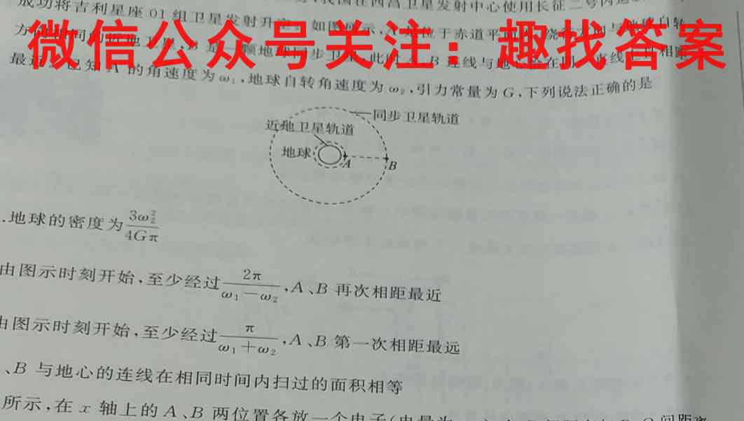 月:成功将吉利星座2日12oo分组H分,我国在西昌卫星发射中心使用长征二号丙运载火箭方向相同的近地卫星星发射升空,如图所示,A是位于赤道平面内、绕行方向与地球自转最近。已知方向相同的近地卫星,B是一颗地球同步卫星,此时A、B连线与地心恰在同一直线上且相A的角速度为A、B2,地球自转角速度为2,,引力常量为G,下列说法正确的是G,步卫星轨道球的密度为为A.地球32224GB.由图示时刻开始,至少经过21-2,A、BB再次相距最近C.由图示时刻开始,至少经过D.A、Bt1+2,A、B3第一次相距最远