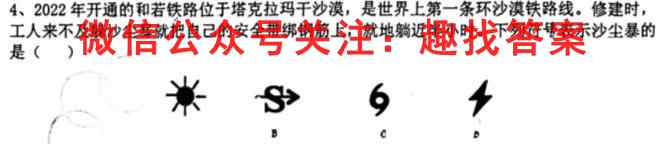 4、2022年开通的和若铁路位于塔克拉玛干沙漠,是世界上第一条环沙漠铁路线。修建时,工人来不及躲沙尘暴就把自己的安全带绑钢筋上,就地躺近半小时。下列符号表示沙尘暴的是()