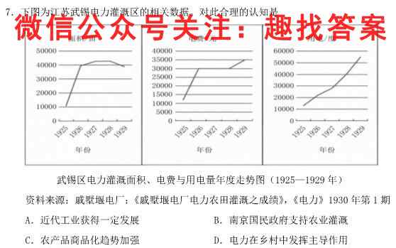 武锡区电力灌溉面积、电费与用电量年度走势图(1925一1929年)资料来源:戚墅堰电厂:《戚墅堰电厂电力农田灌溉之成绩》,《电力》1930年第1期A.近代工业获得一定发展B.南京国民政府支持农业灌溉C.农产品商品化趋势加强D.电力在乡村中发挥主导作用