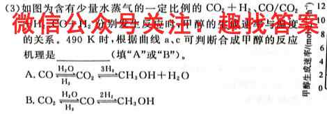 (3)如图为含有少量水蒸气的一定比例的CO2+H2、CO/CO2与12+H2、CO+H2分别发生反应时,甲醇的生成速率与温度490K的关系。490K时,根据曲线a、c可判断合成甲醇的反应机理是(填“A’”或“B”)。A.COH2OH2CO23H2CH3OH+H2OB.CO2H3OH2COHH3CH3OH