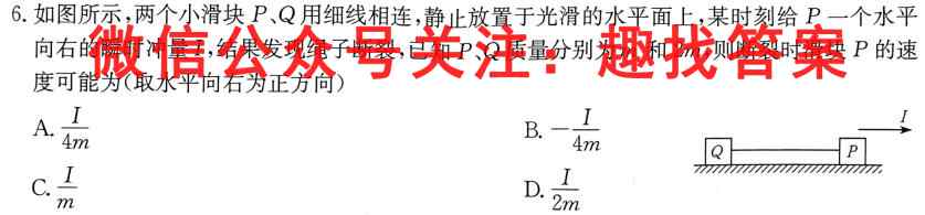 6.如图所示,两个小滑块P、Q用细线相连,静止放置于光滑的水平面上,某时刻给P一个水平向右的瞬时冲量I,结果发现绳子断裂,已知P、Q质量分别为m和2m,则断裂时滑块P的速度可能为(取水平向右为正方向)A.I4mB.-I4mC.ImD.I2mP