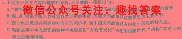1.下列关于原文内容的理解和分析,不正确的一项是(3分)A.“神奇婚姻”类民间故事把自然世界人格化,包含了浓郁的人的情感化内容的生态情怀。B.儒、道、佛都主张人要尊重自然万物的生命,因而民间故事以这些思想为主要内容。C.西方生态思想有明确的社会目的和诉求,而中国民间故事具有内化于灵魂的持久性。D.动物故事中生态意识的独特审美形态以“万物有灵论”为基础想象世界,“动物”有与人相似的思维和情感。