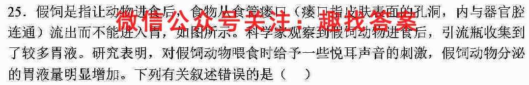 25.假饲是指让动物进食后,食物从食管瘘口(瘘口指皮肤表面的孔洞,内与器官腔连通)流出而不能进入胃,如图所示。科学家观察到假饲动物进食后,引流瓶收集到了较多胃液。研究表明,对假饲动物喂食时给予一些悦耳声音的刺激,假饲动物分泌的胃液量明显增加。下列有关叙述错误的是()