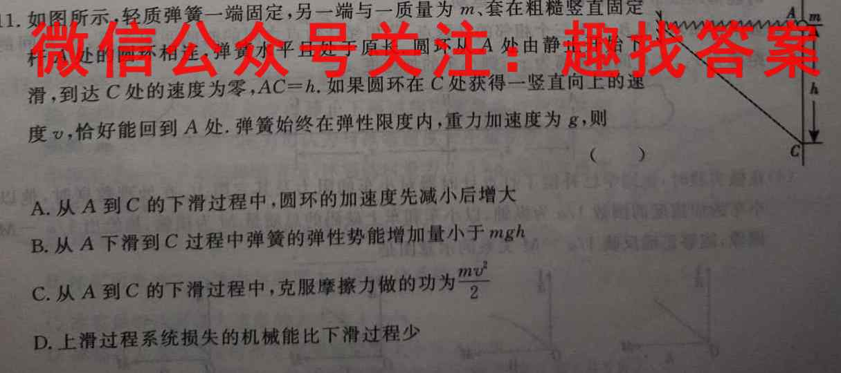 11.如图所示,轻质弹簧一端固定,另一端与一质量为m、套在粗糙竖直固定杆A处的圆环相连,弹簧水平且处于原长.圆环从A处由静止开始下滑,到达C处的速度为零,AC=h.如果圆环在C处获得一竖直向上的速度v,恰好能回到A处.弹簧始终在弹性限度内,重力加速度为g,则()mhA.从A到C的下滑过程中,圆环的加速度先减小后增大B.从A下滑到C过程中弹簧的弹性势能增加量小于mghC.从A到C的下滑过程中,克服摩擦力做的D.上滑过程系统损失的机械能比下滑过程少
