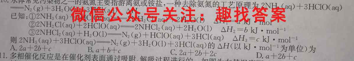 10.水体常见污染物之一的氨氮主要指游离氨或铵盐,一种去除氨氮的工艺原理为2NH3(aq)+3HClO(aq)=N2(g)+3H2O(1)+3HCl(aq)△H。已知:12NH3(aq)+2HClO(aq)2NH2Cl(aq)+2H2O(l)H1=akJmol^-22NH2Cl(aq)+2HClO(aq)2NVHCl2(aq)+2H2O(1)H2=bkJmol^-1③22NHCl2(aq)+H2O(l)N2(g)+HClO(aq)+3HCl(aq)H3=ckJmol^-1则2NH3(aq)+3HClO(aq)N2(g)+3H2O(1)+3Hg)+3H:O(1)+3HCl(aq)的△H(以kJmol^-1为单位)为A.2a+2b+cB.a+b+cC.2a+2b+2cD.a+2b+c