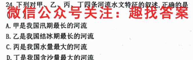 24.下列对甲、乙、丙、丁四条河流水文特征的叙述,正确的是()A.甲是我国汛期最长的河流B.乙是我国结冰期最长的河流C.丙是我国水量最大的河流D.丁是我国含沙量最大的河流