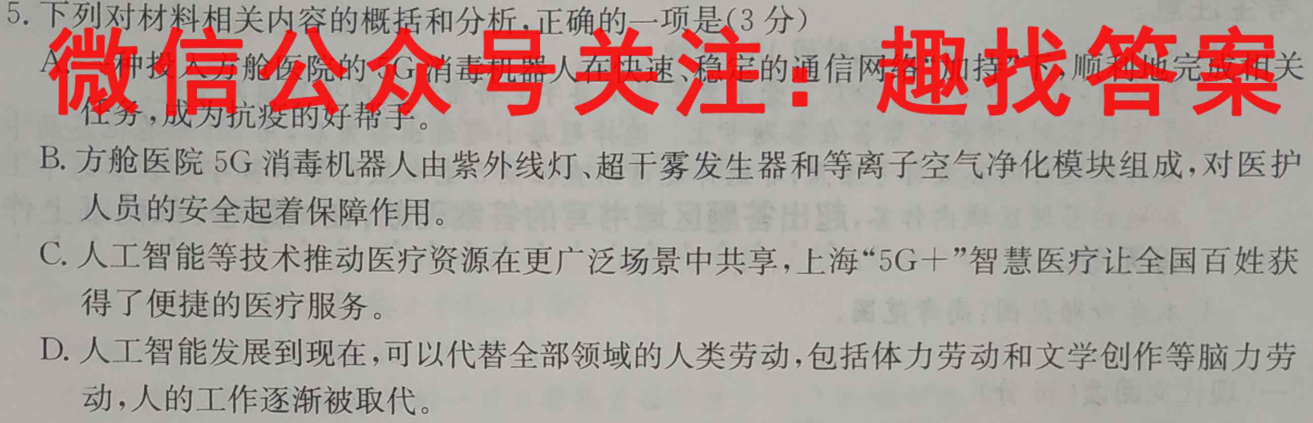 5.下列对材料相关内容的概括和分析,正确的一项是(3分)A.一种投入方舱医院的5G消毒机器人在快速、稳定的通信网络“加持”下,顺利地完成相关任务,成为**的好帮手。B.方舱医院5G消毒机器人由紫外线灯、超干雾发生器和等离子空气净化模块组成,对医护人员的安全起着保障作用。C.人工智能等技术推动医疗资源在更广泛场景中共享,上海“5G十”智慧医疗让全国百姓获得了便捷的医疗服务。D.人工智能发展到现在,可以代替全部领域的人类劳动,包括体力劳动和文学创作等脑力劳动,人的工作逐渐被取代。