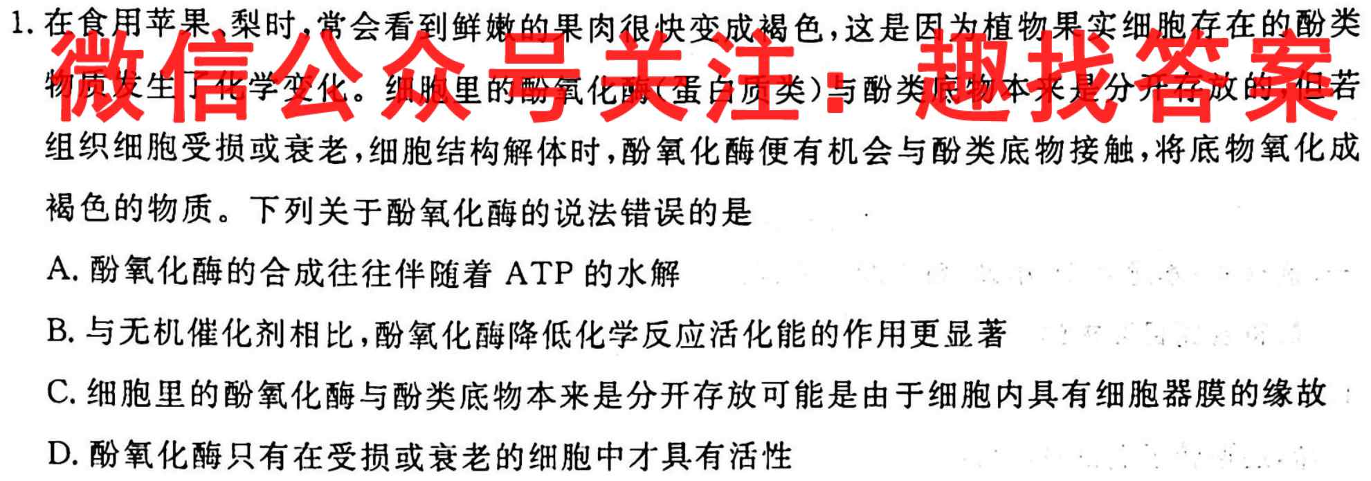 1.在食用苹果、梨时,常会看到鲜嫩的果肉很快变成褐色,这是因为植物果实细胞存在的酚类物质发生了化学变化。细胞里的酚氧化酶(蛋白质类)与酚类底物本来是分开存放的,但若组织细胞受损或衰老,细胞结构解体时,酚氧化酶便有机会与酚类底物接触,将底物氧化成褐色的物质。下列关于酚氧化酶的说法错误的是A.酚氧化酶的合成往往伴随着ATP的水解B.与无机催化剂相比,酚氧化酶降低化学反应活化能的作用更显著C.细胞里的酚氧化酶与酚类底物本来是分开存放可能是由于细胞内具有细胞器膜的缘故D.酚氧化酶只有在受损或衰老的细胞中才具有活性