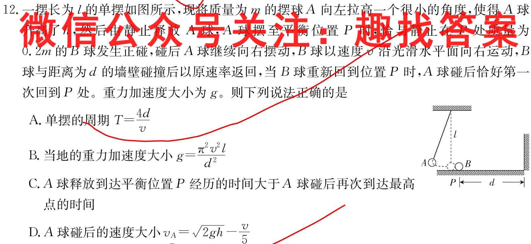 12.一摆长为l的单摆如图所示,现将质量为m的摆球A向左拉高一个很小的角度,使得A球升高了h,然后由静止释放A球,A球摆至平衡位置P时,恰与静止在P处质量为0.2m的B球发生正碰,碰后A球继续向右摆动,B球以速度沿光滑水平面向右运动,B球与距离为d的墙壁碰撞后以原速率返回,当B球重新回到位置P时,A球碰后恰好第一次回到P处。重力加速度大小为,则下列说法正确的是A.单摆的周期T=4dvB.当地的重力加速度大小g=^2v^2ld^2D.A球碰后的速度大小vA=2gh-v5C.A球释放到达平衡位置点的时间P经历的时间大于A球碰后再次到达最高